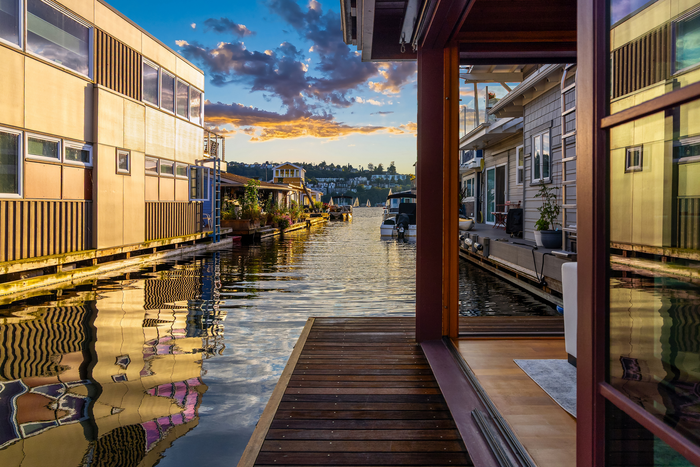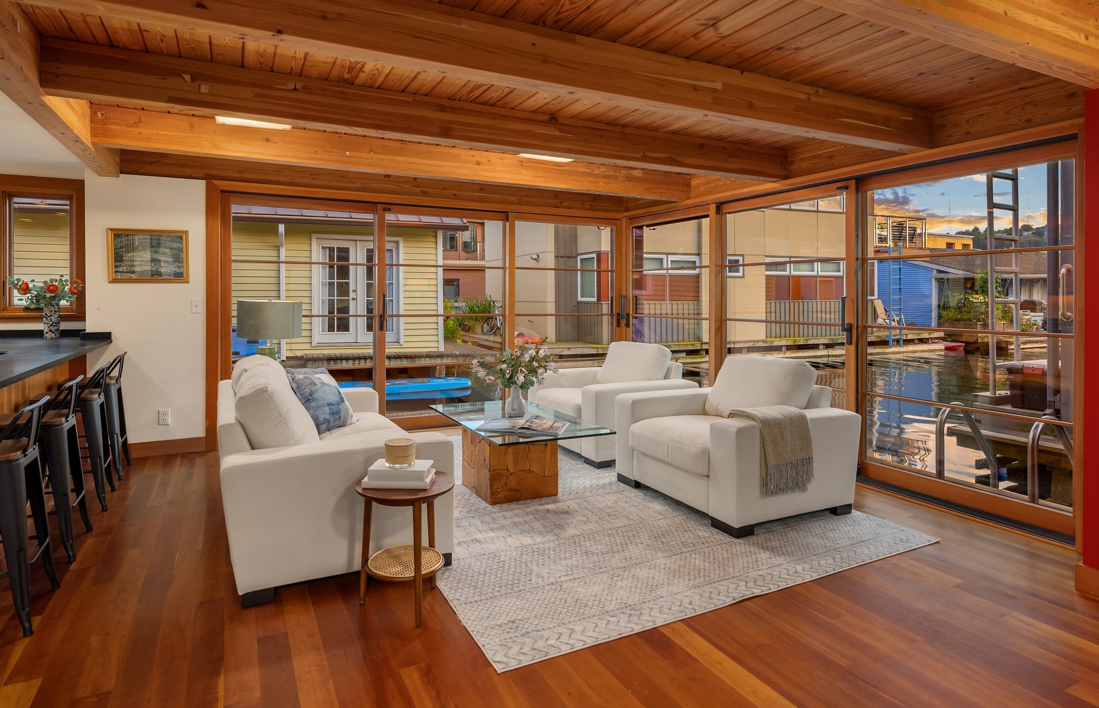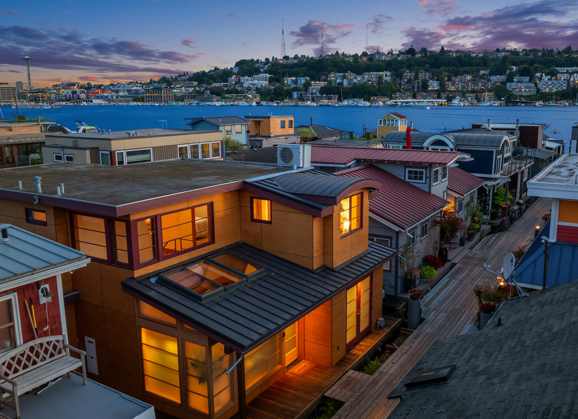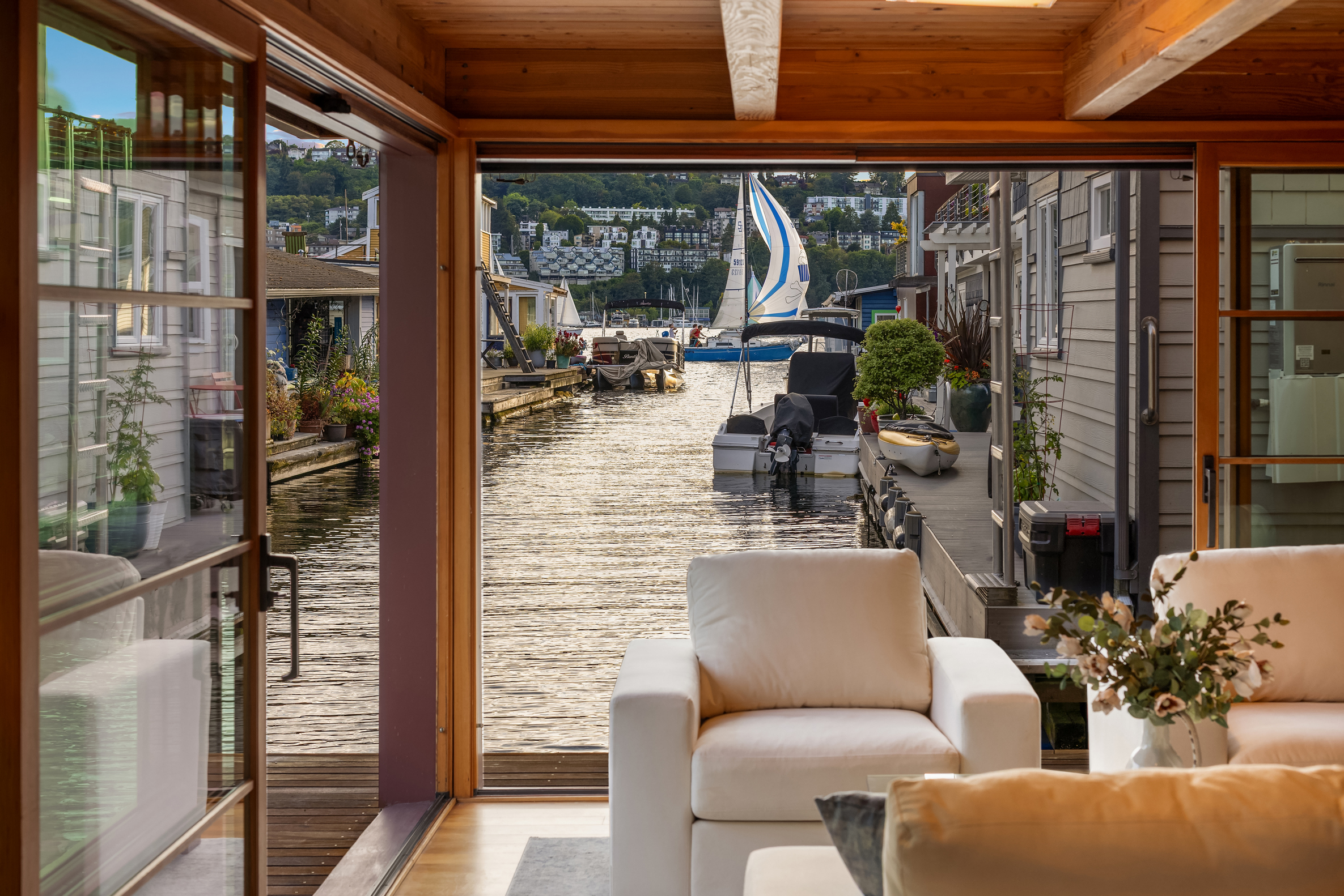 Custom-built Japanese-inspired NW Contemporary floating home juts into its sunny south-side slip—a rare placement offering unobstructed channel views of Lake Union. Corner living room glass sliders fuse interior space with the water’s edge for seamless indoor-outdoor living. Expansive 3-level floorplan features 3 proper bedrooms, a concrete float with a full-height finished basement, CVG fir cabinetry and trim, exposed beam ceilings and exterior clad in PRODEMA® siding. Modern comforts like Fiber internet, heat-pump heating/cooling and natural-gas tankless water heater. Located on Eastlake in the well-run 'Tenas Chuck' co-op. No-stairs dock with upgraded infrastructure including new steel pilings, plus a tucked-away city parking lot with 4 EV chargers.