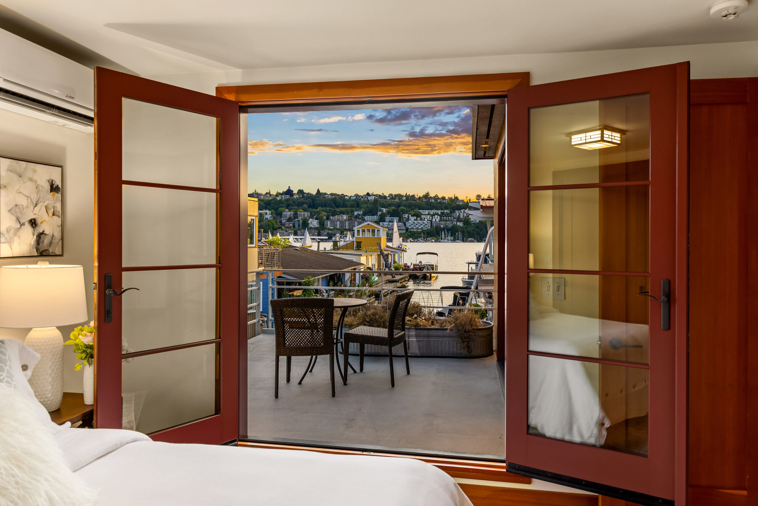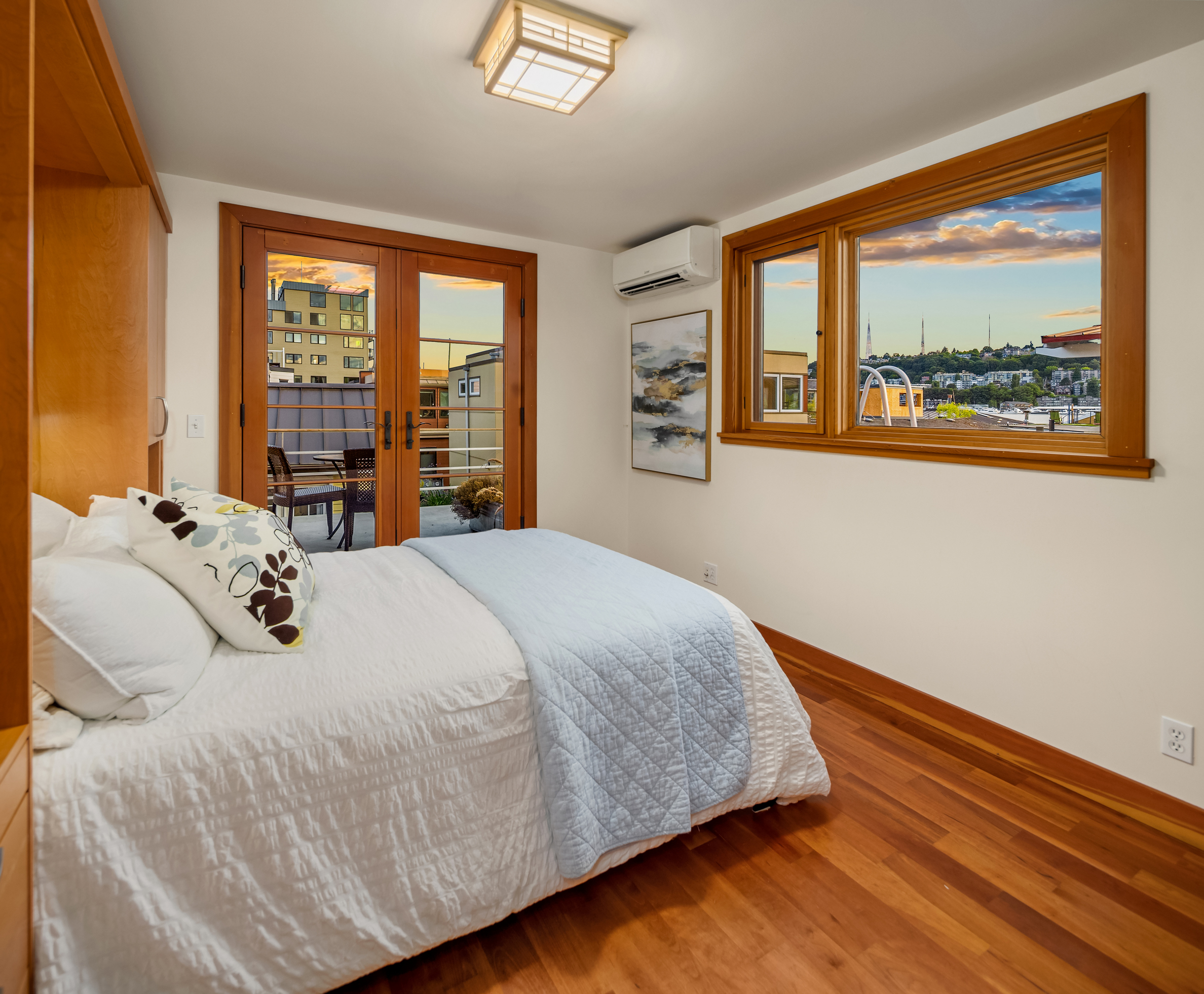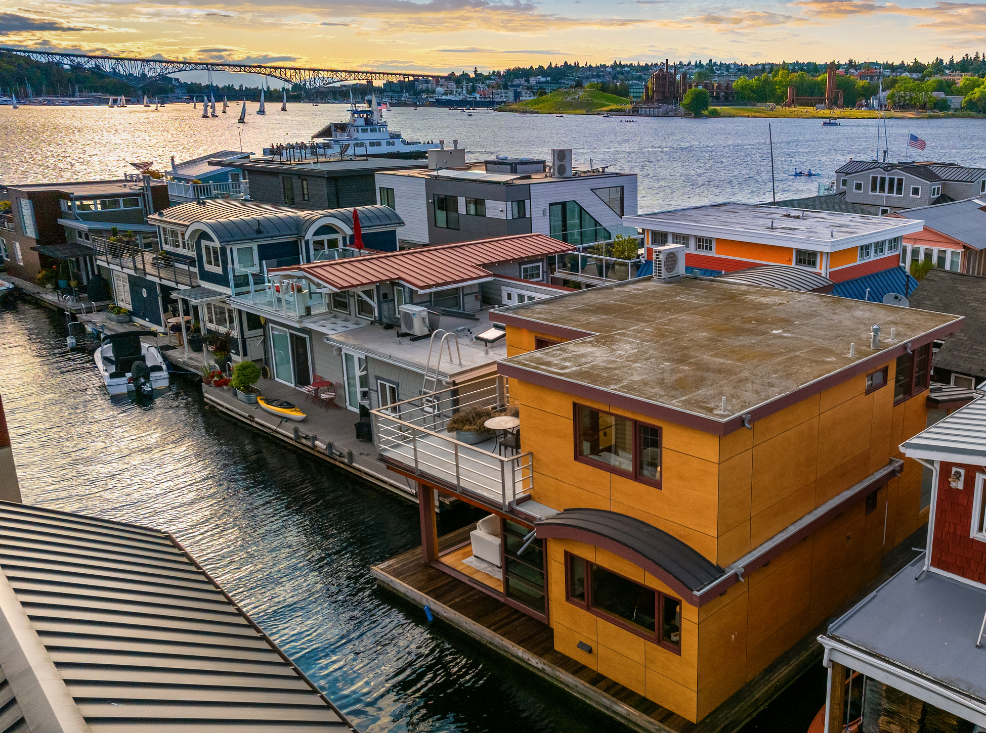 Custom-built Japanese-inspired NW Contemporary floating home juts into its sunny south-side slip—a rare placement offering unobstructed channel views of Lake Union. Corner living room glass sliders fuse interior space with the water’s edge for seamless indoor-outdoor living. Expansive 3-level floorplan features 3 proper bedrooms, a concrete float with a full-height finished basement, CVG fir cabinetry and trim, exposed beam ceilings and exterior clad in PRODEMA® siding. Modern comforts like Fiber internet, heat-pump heating/cooling and natural-gas tankless water heater. Located on Eastlake in the well-run 'Tenas Chuck' co-op. No-stairs dock with upgraded infrastructure including new steel pilings, plus a tucked-away city parking lot with 4 EV chargers.