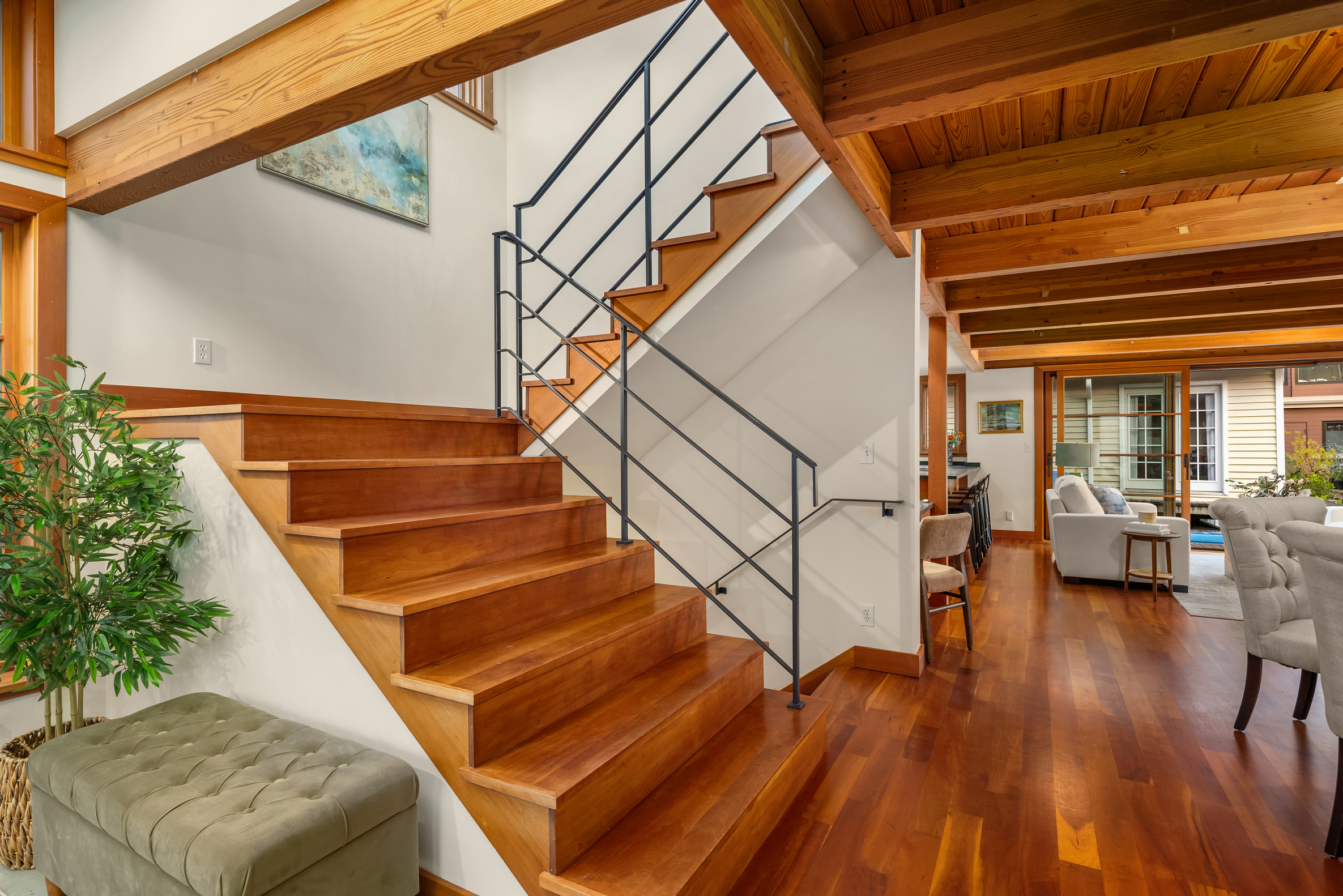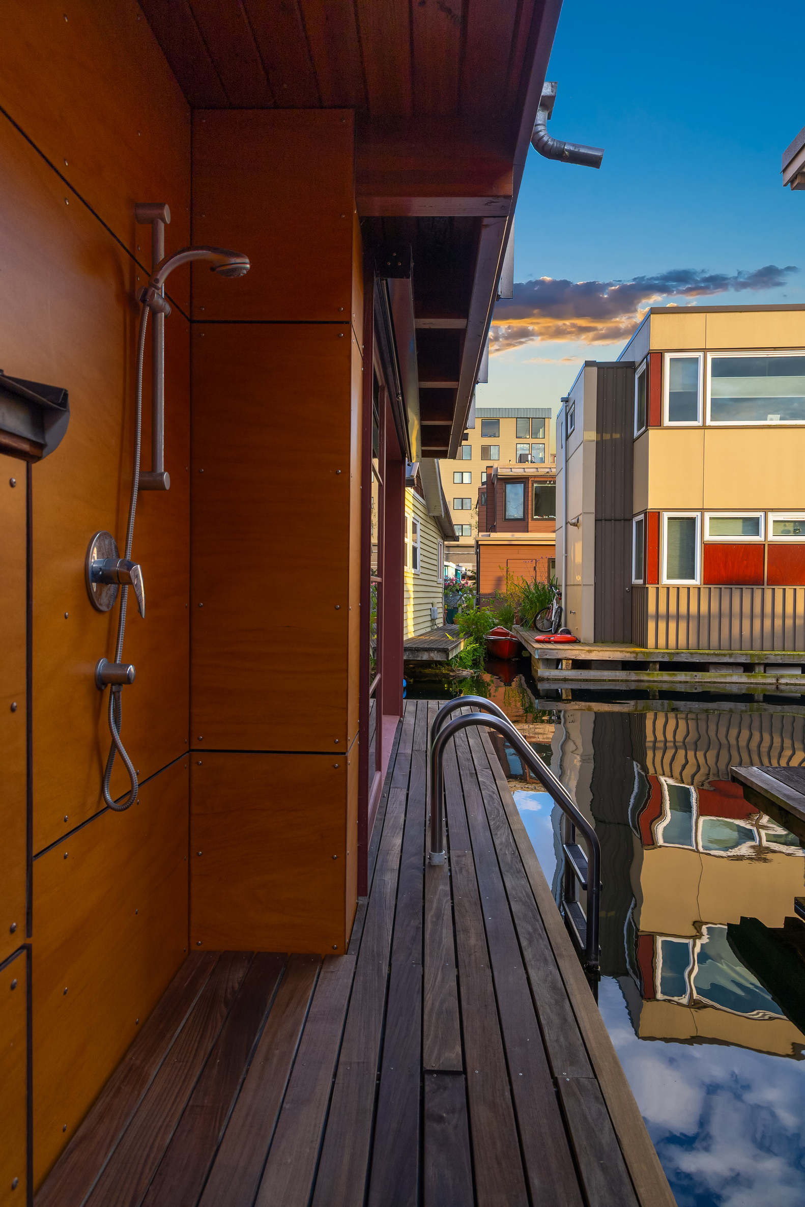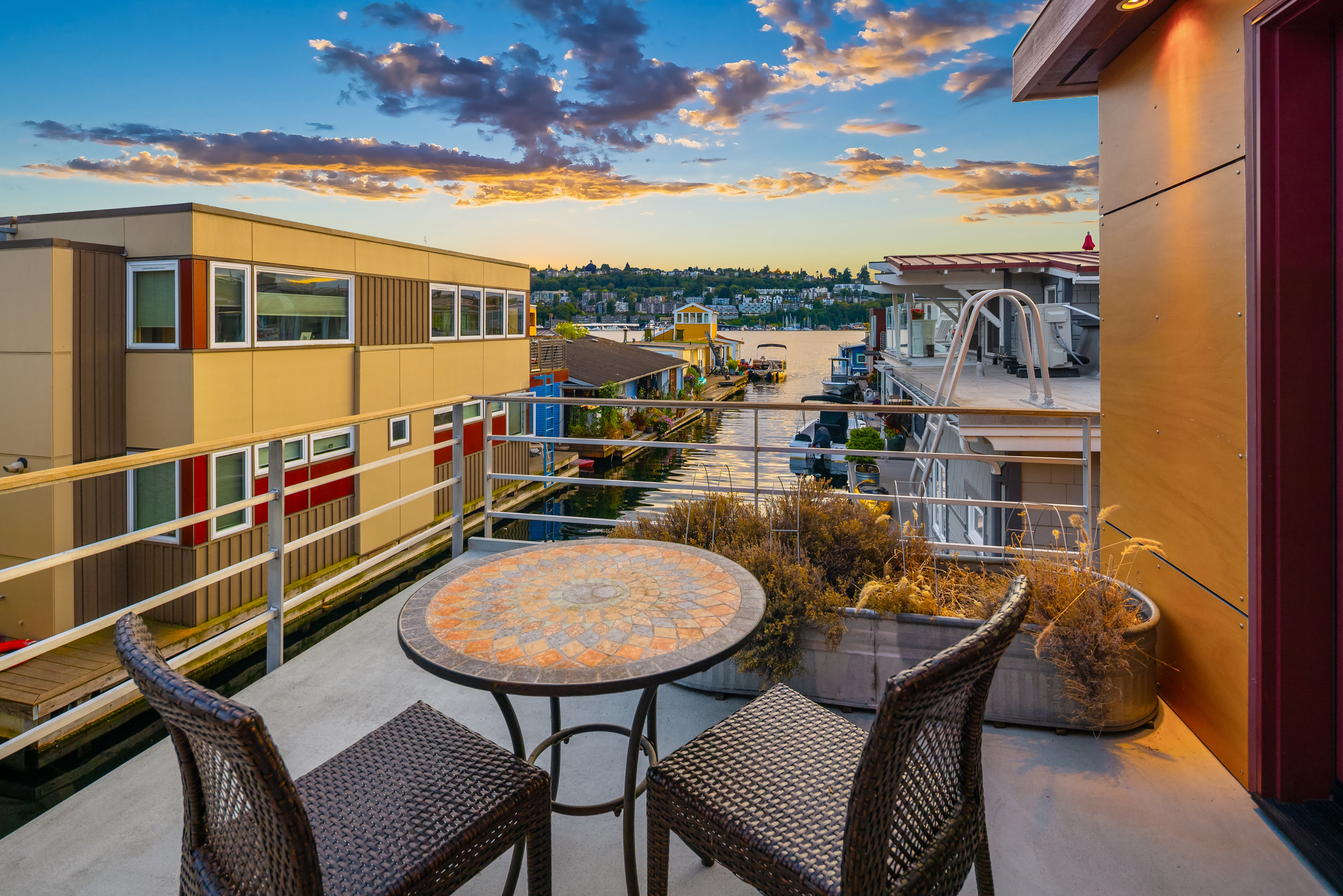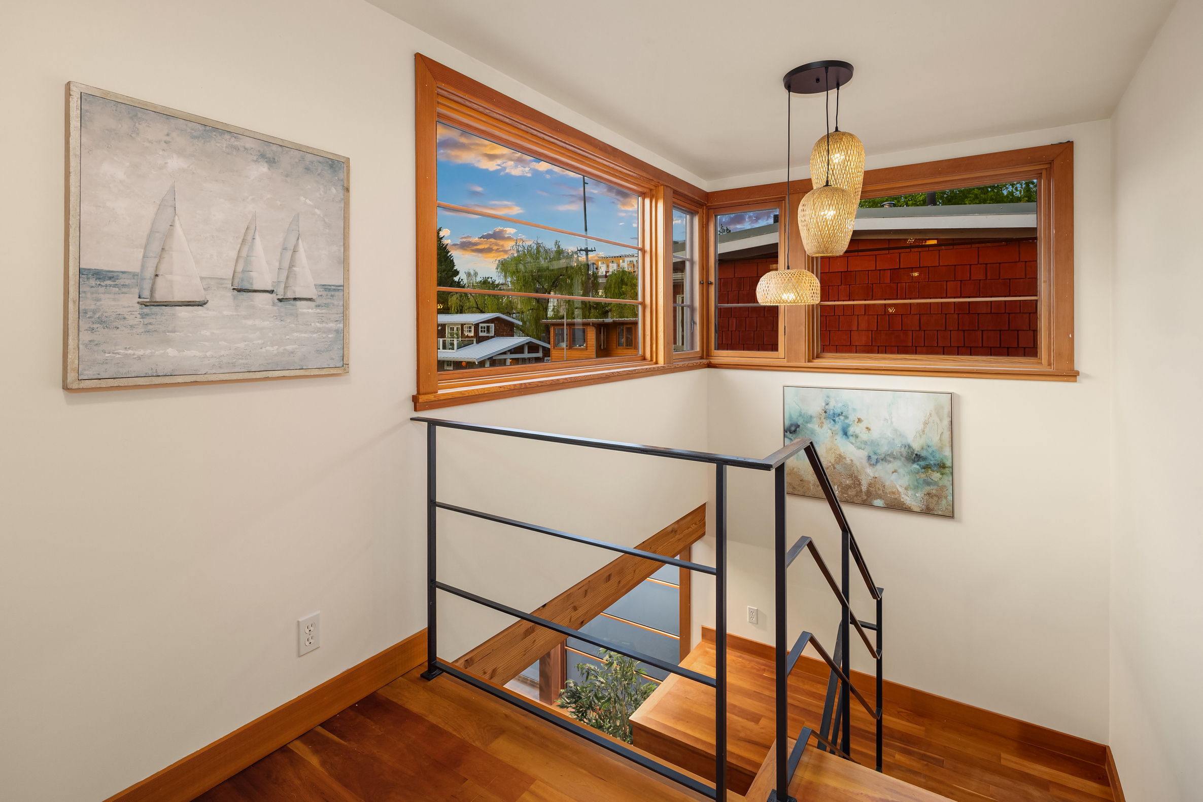 Custom-built Japanese-inspired NW Contemporary floating home juts into its sunny south-side slip—a rare placement offering unobstructed channel views of Lake Union. Corner living room glass sliders fuse interior space with the water’s edge for seamless indoor-outdoor living. Expansive 3-level floorplan features 3 proper bedrooms, a concrete float with a full-height finished basement, CVG fir cabinetry and trim, exposed beam ceilings and exterior clad in PRODEMA® siding. Modern comforts like Fiber internet, heat-pump heating/cooling and natural-gas tankless water heater. Located on Eastlake in the well-run 'Tenas Chuck' co-op. No-stairs dock with upgraded infrastructure including new steel pilings, plus a tucked-away city parking lot with 4 EV chargers.